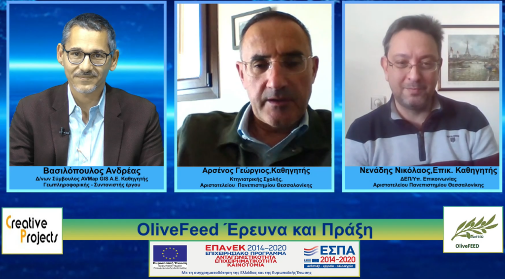 Ο καθηγητής Κτηνιατρικής και Διευθυντής του Εργαστηρίου Ζωοτεχνίας, κύριος Αρσένος Γεώργιος και ο Επίκουρος Καθηγητής, κύριος Νενάδης Νικόλαος από το Εργαστήριο Χημείας και Τεχνολογίας Τροφίμων ανέλυσαν τη συμβολή των εργαστηρίων στην υλοποίηση του έργου Olivefeed.